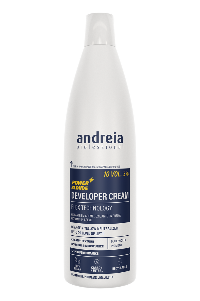 Add extra power to your blonde coloration or lightening with Andreia Power Blonde Cream Developer. The creamy, vegan formula contains blue violet pigment to neutralise unwanted tones while plex technology hydrates and nourishes the hair.