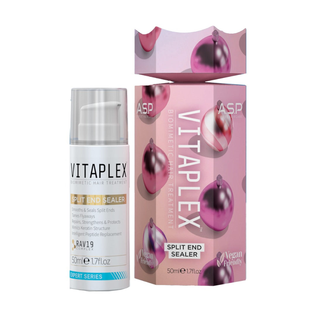 Eliminate split ends this Christmas with the ASP Vitaplex Split End Sealer Christmas Cracker. This essential treatment smooths, protects, and revitalizes split ends and flyaways, all beautifully presented with festive sparkle, perfect for the holiday season.