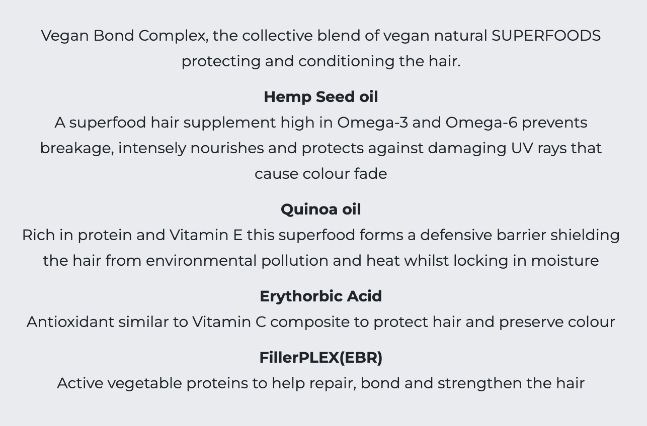 This gentle formula contains Vegan Bond Complex, which is a collective blend of vegan superfoods that protect and condition the hair.