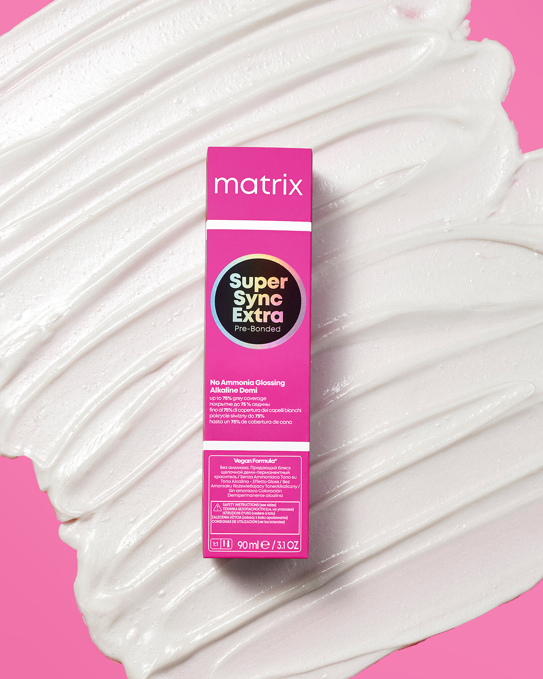 A: Matrix Super Sync is a revolutionary pre-bonded, alkaline demi-permanent hair color. It offers up to 75% grey coverage*, long-lasting results for up to 9 weeks***, and advanced fiber protection, all with a zero-ammonia formula that leaves hair glossy and nourished.