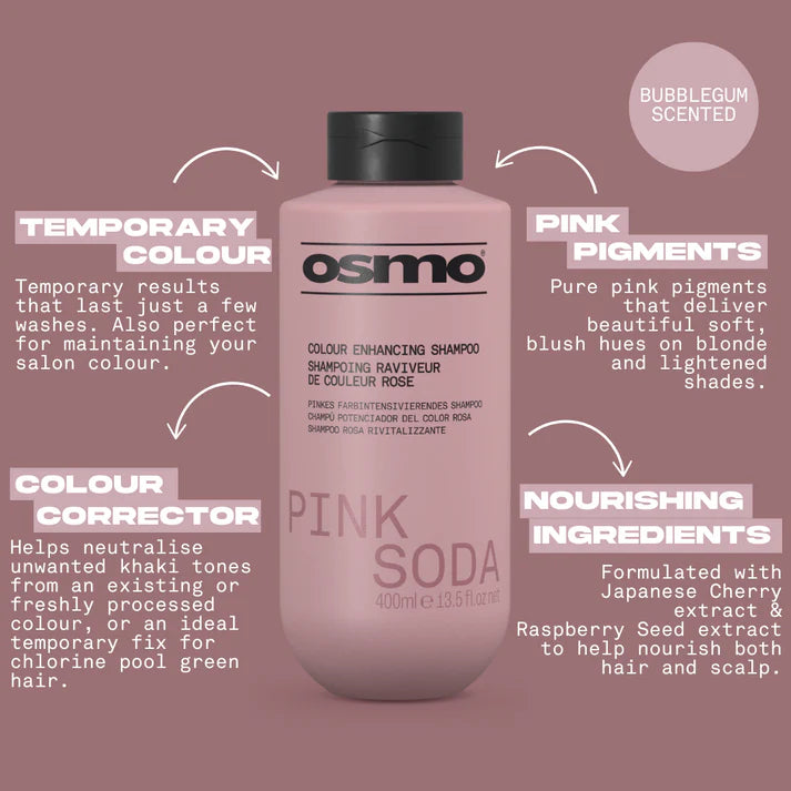 The Osmo Pink Soda Shampoo is a gentle, temporary, colour-enhancing shampoo containing pink pigments that deliver beautiful soft hues in blonde and lightened hair. Perfect for maintaining your in-salon pink shade.